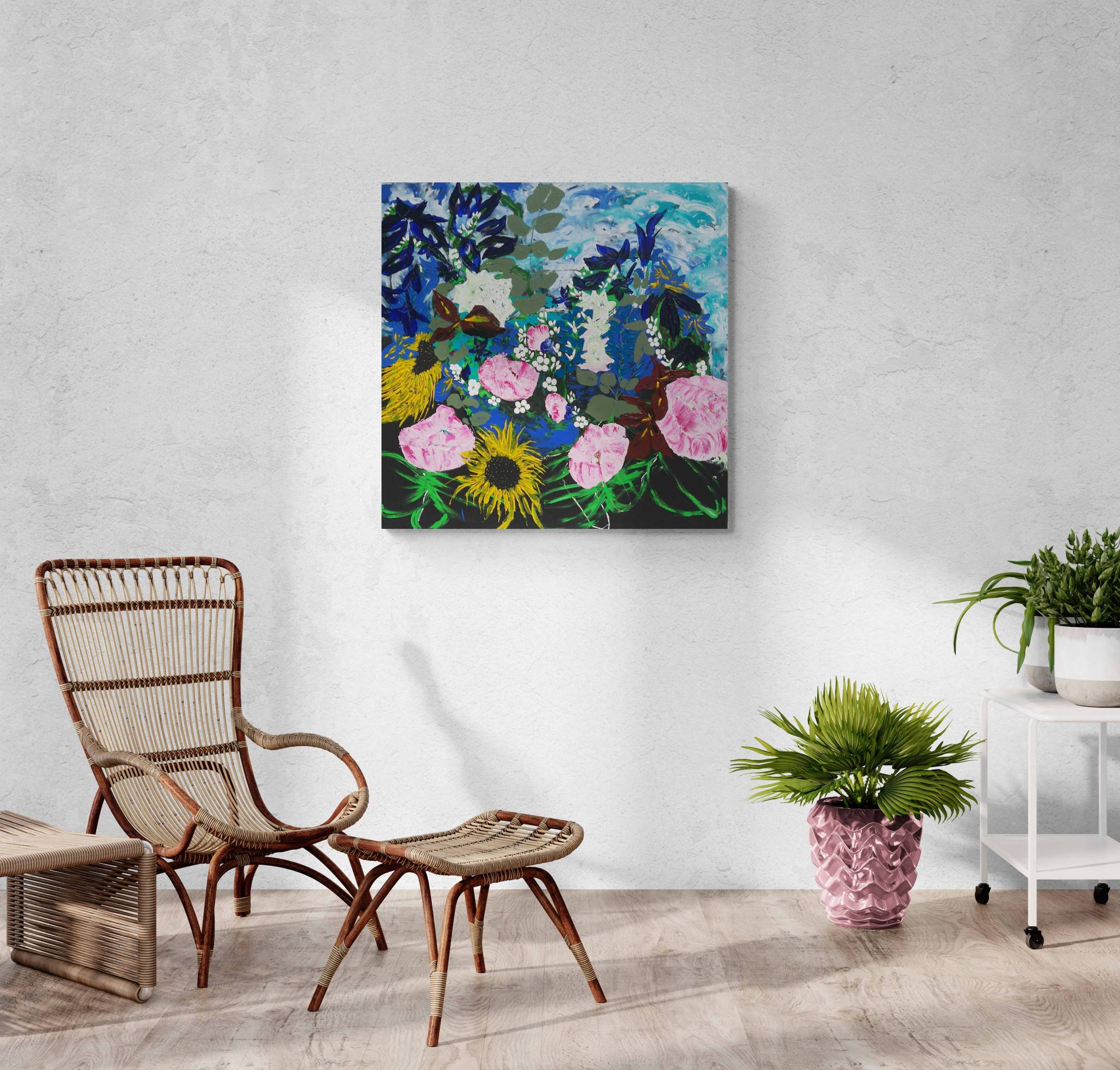This tumbling bouquet of luscious blooms was painted from 4 am in the morning, after a happy and life changing party: I was leaving education to become a full time painter. Over the following days, it took grip of my energy and the colours litterally burst on the mat black canvas.