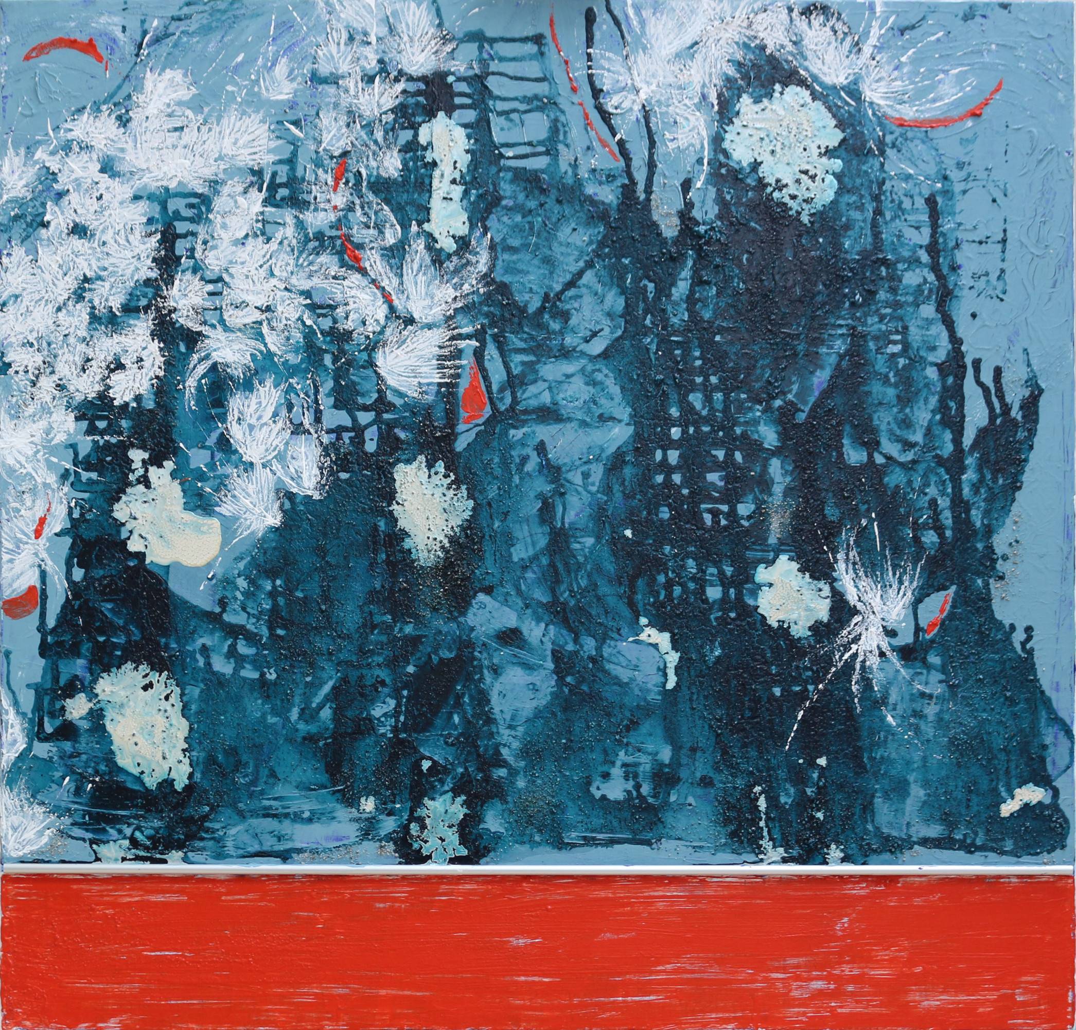 This painting changed names many times- it was during an Open Studio event that the name "Reef" appeared. I liked the effect of underworld flora, with coral red ,arks in the foreground. A brushed steel bar marks the shoreline. But it remains an abstract, highly textured and variable with lighting effects.