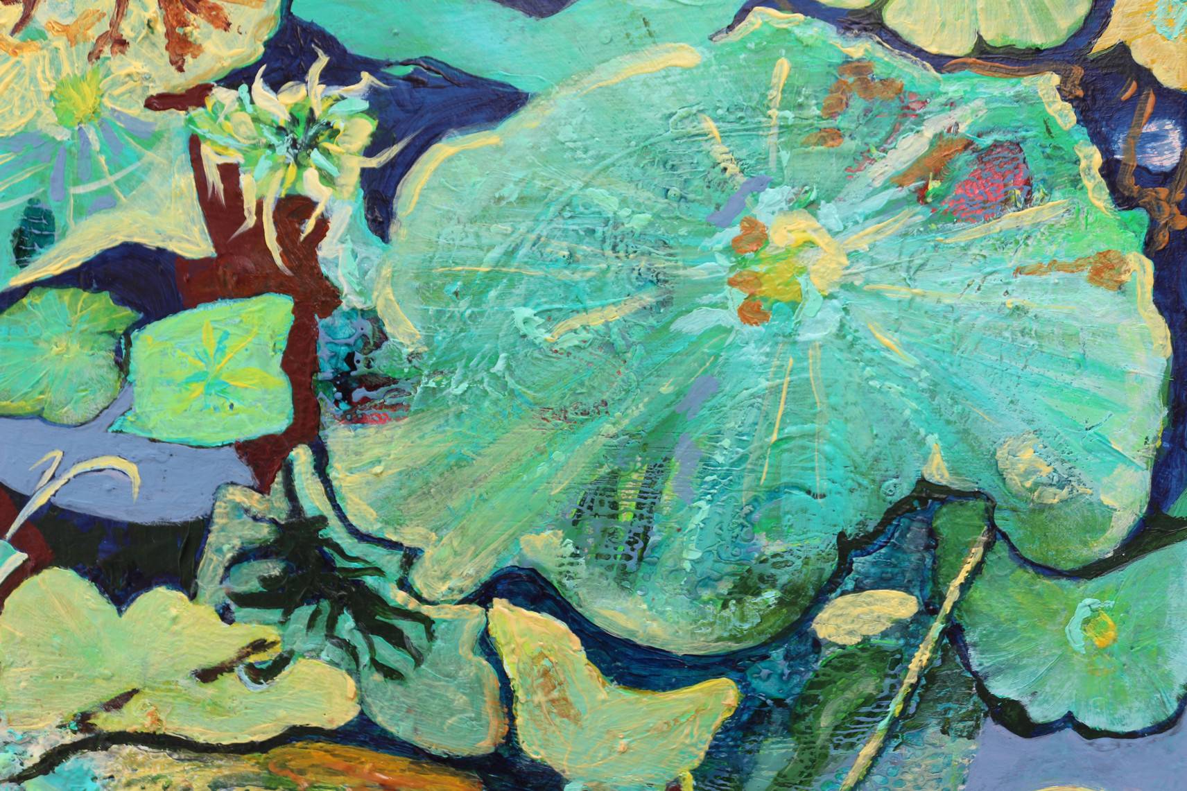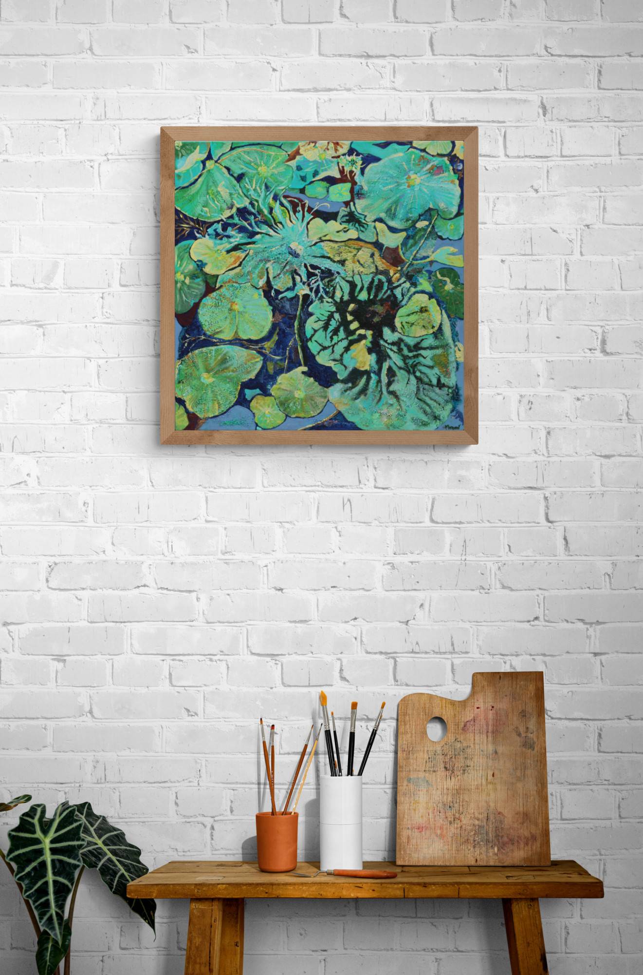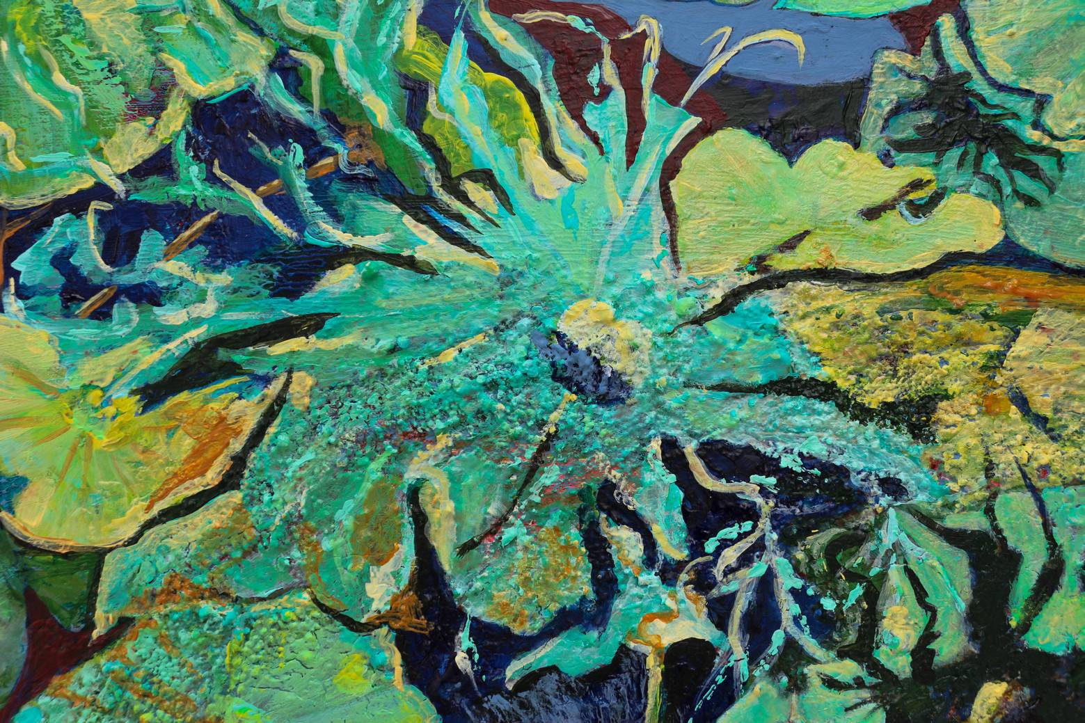 Semi figurative lotus leaves on a pond- very textured with sand and varnishes on canvas.