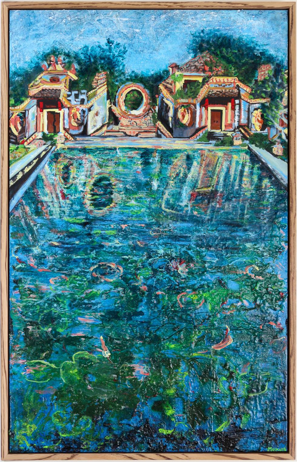 A large lily pond in a town square of Ancient Hoi Han, Vietnam, reflects this 400 year old gate to a temple. An intriguing place...it was very theatrical: the 3 sides were as a stage, with inviting worn vermillion wooden doors. But there are no temples behind.