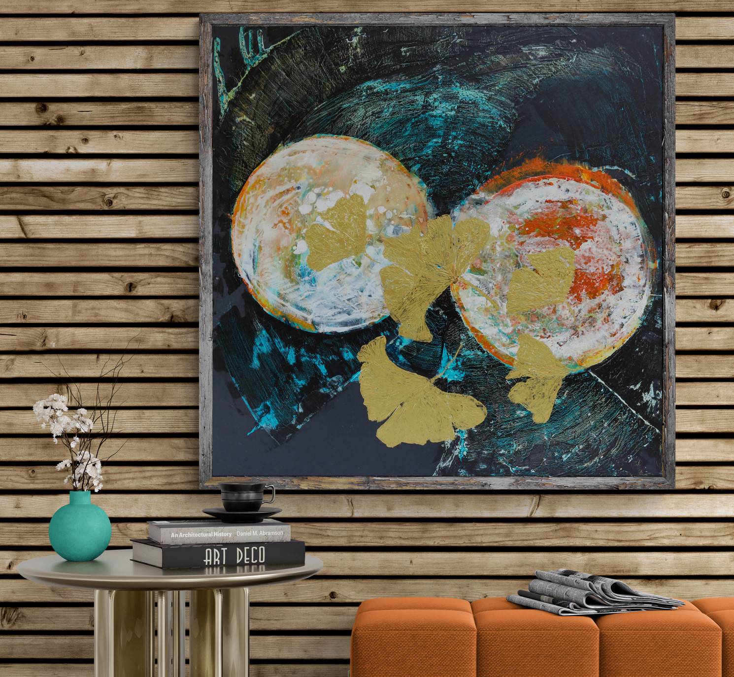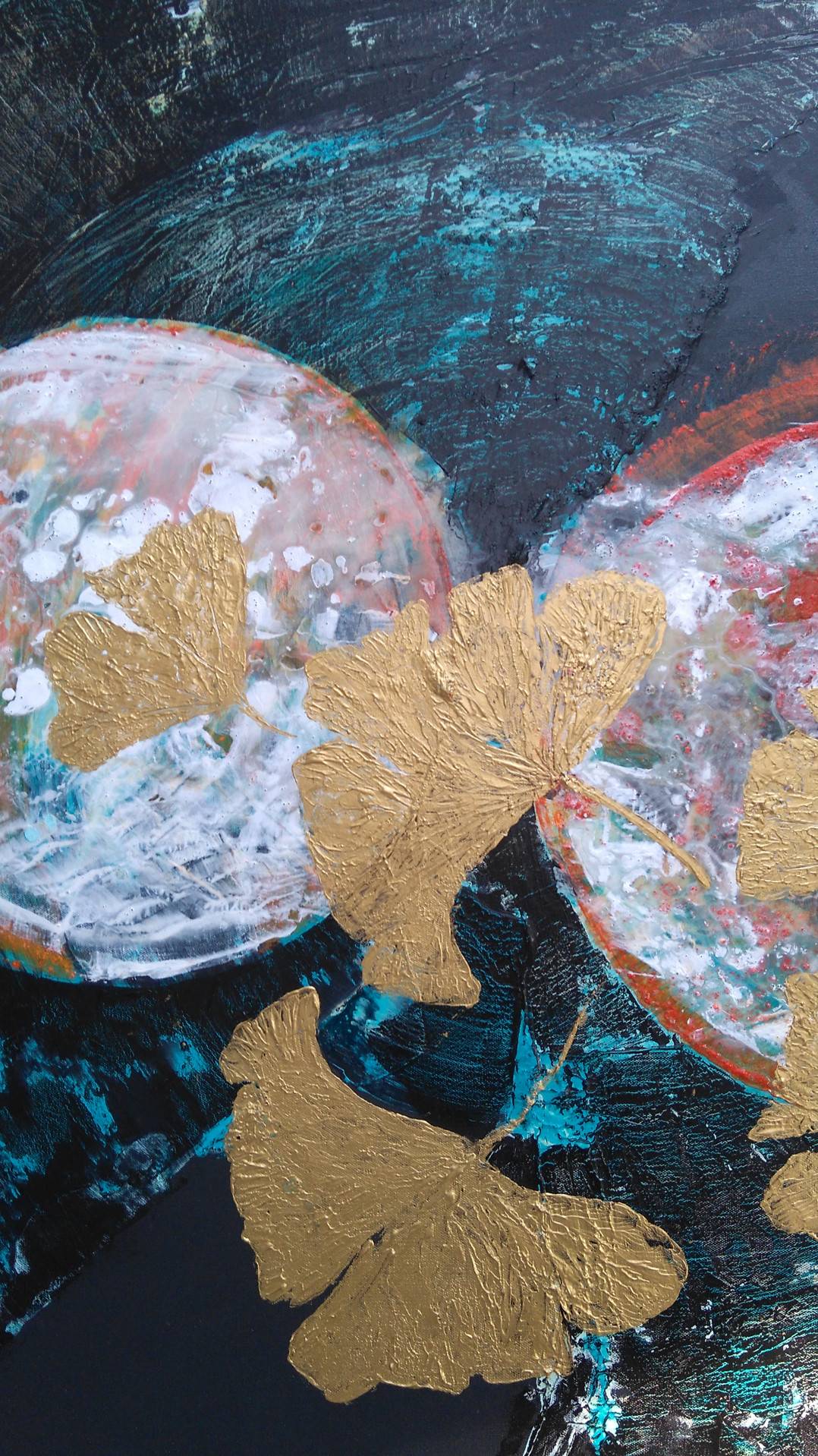 From the “Japan Series”, iconic ginkgo leaves are displayed with textured gold brush strokes against moon motifs on a black, mat canvas. The composition is both vibrant and semi- abstract, letting the elegance and beauty of those fan shape leaves take centre stage.