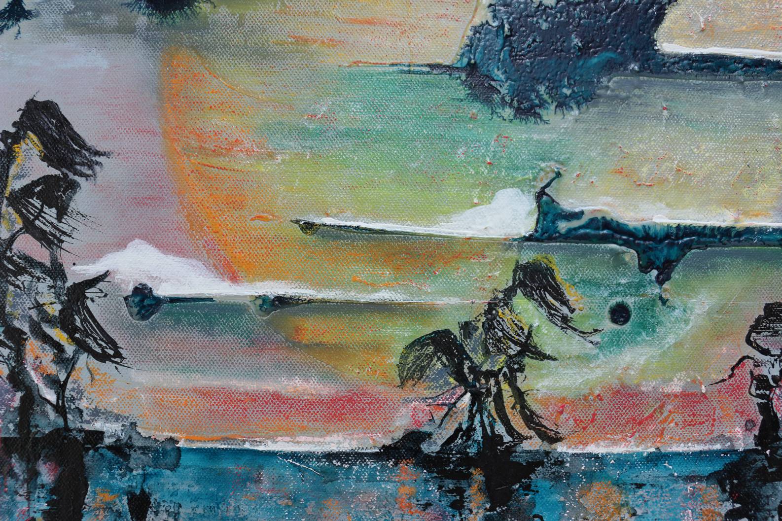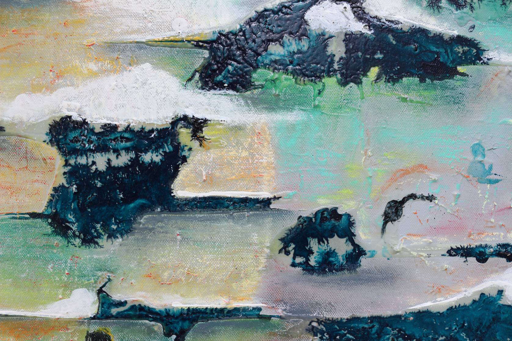 The wind brushes the trees whilst the moon peers through clouds, creating an atmosphere of quiet beauty. Chalk paint textures the background, and adds to the etherealness, whilst oil pastel touches bring warmth and vibrancy.