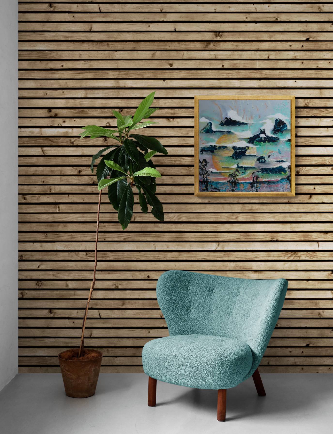 A semi-abstract composition inspired by Master Hiroshige who was very fond of the dramatic cryptomere pine branches sweeping across landscapes.