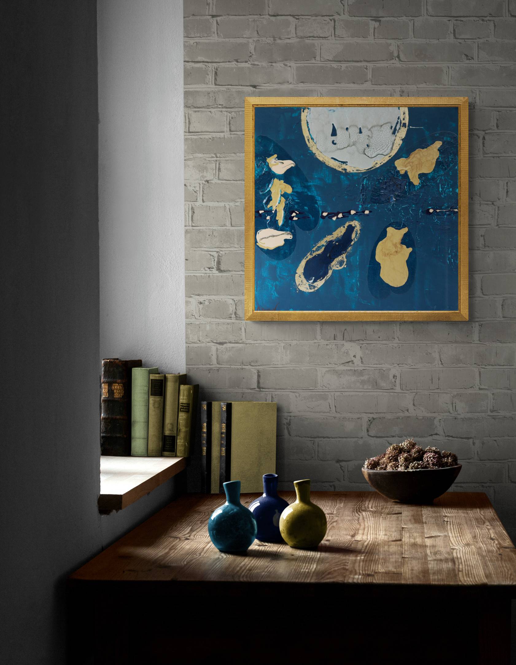 The moon motif and its bright light shade the other shapes on the dark turquoise background. It would look even more decorative within a gold, mat tray frame.