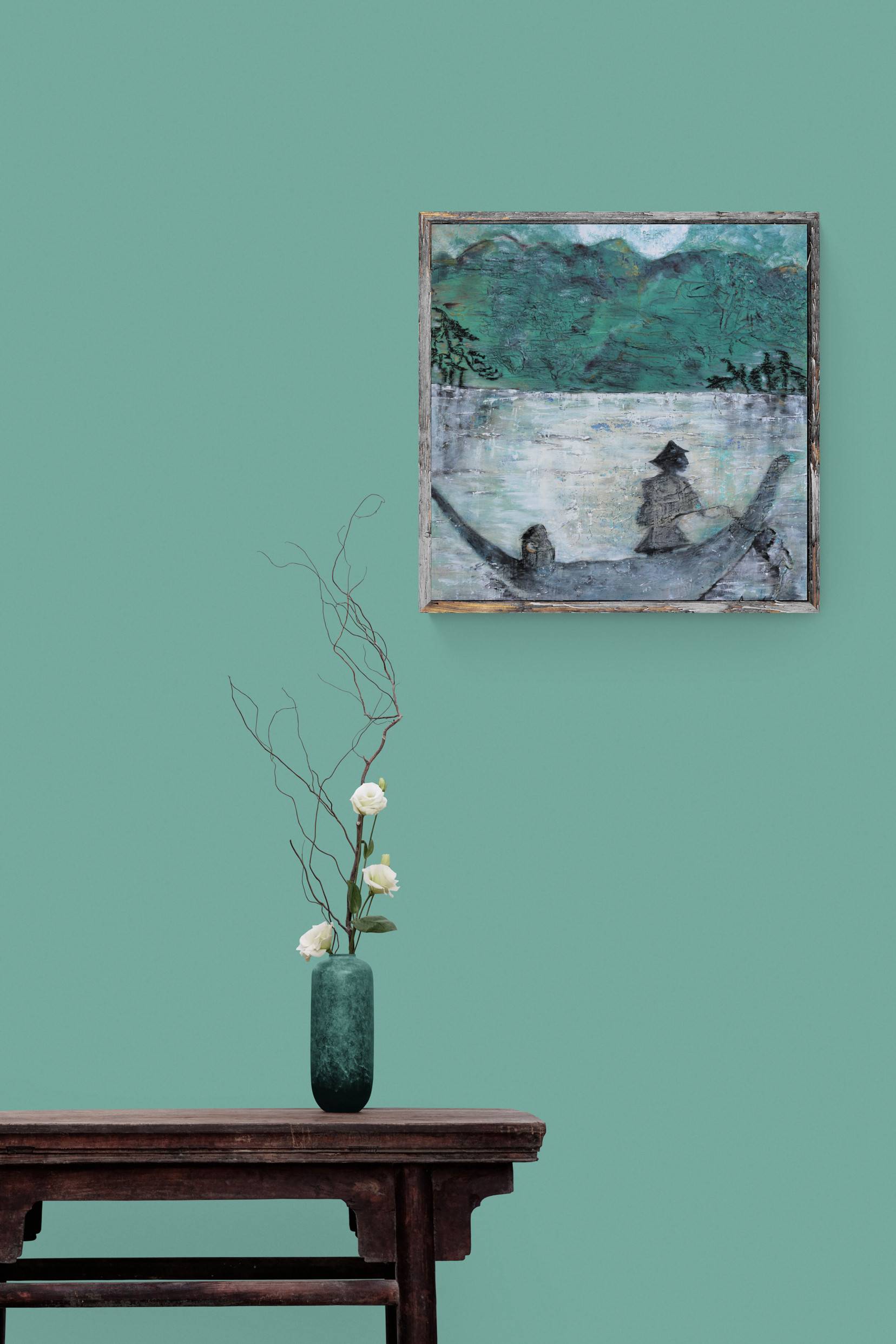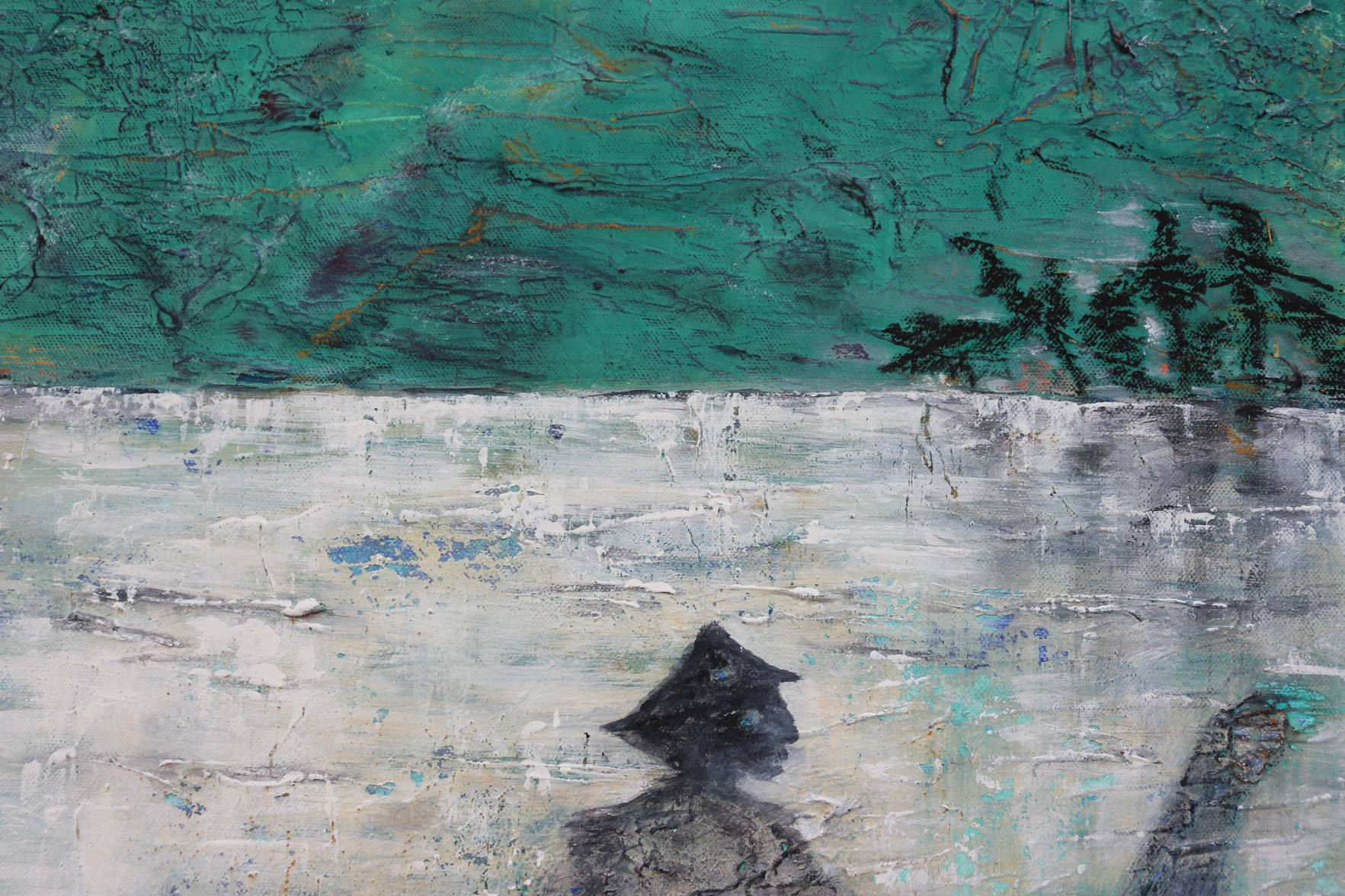 The moon light plays reflection on the river- multi layered paint, acrylic and chalk give a feeling of tranquility to this contemplative painting. This was created slowly as an exercise in mindfulness on my return form Japan.