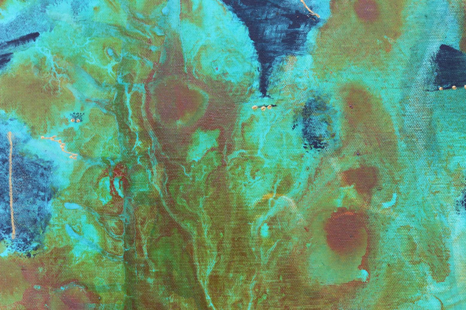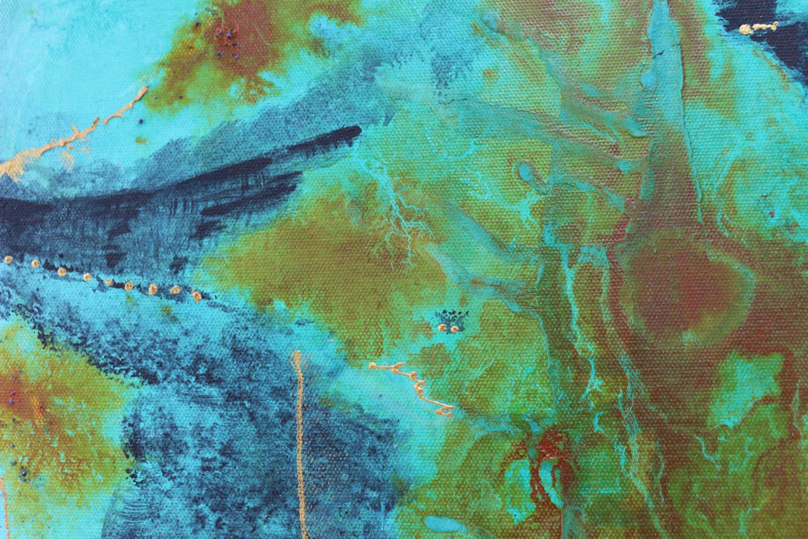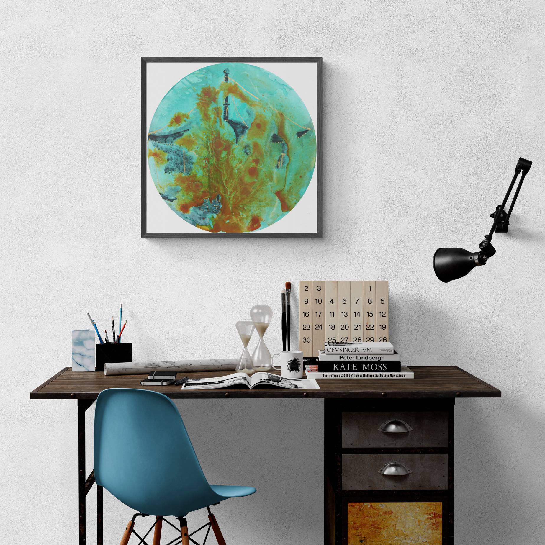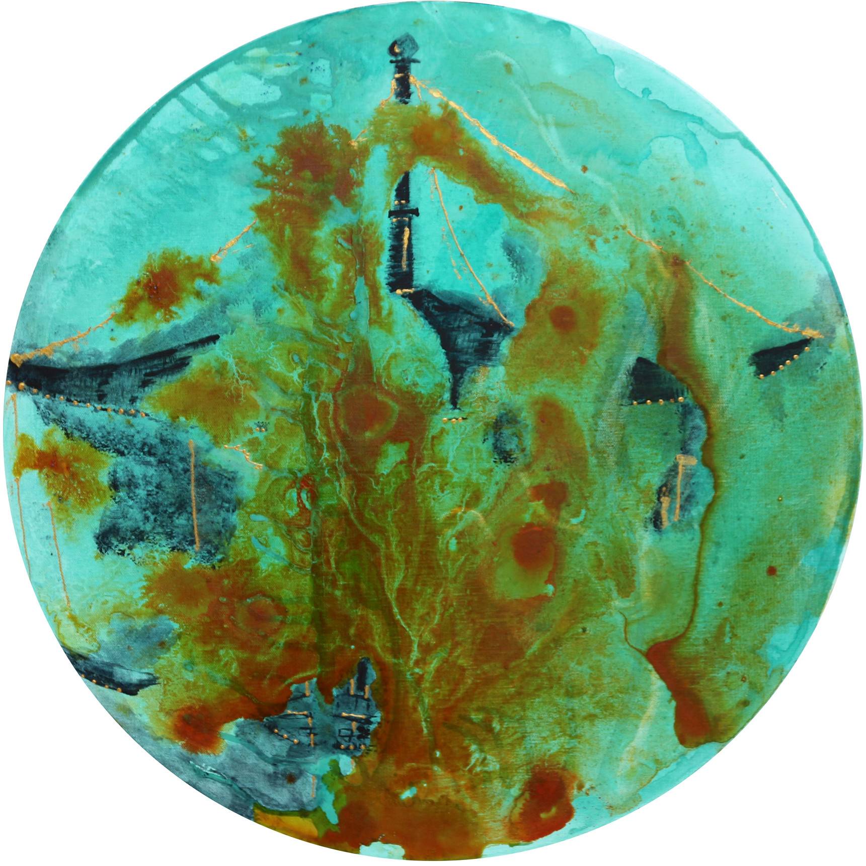 A semi-abstract round painting on canvas, where my favourite hues of turquoise and orange mingle in an abstract flow; you may distinguish a pagoda at dusk. This was inspired by the Kyomizu-Dera Temple in Kyoto at dusk. An experience for the senses I shall never forget.