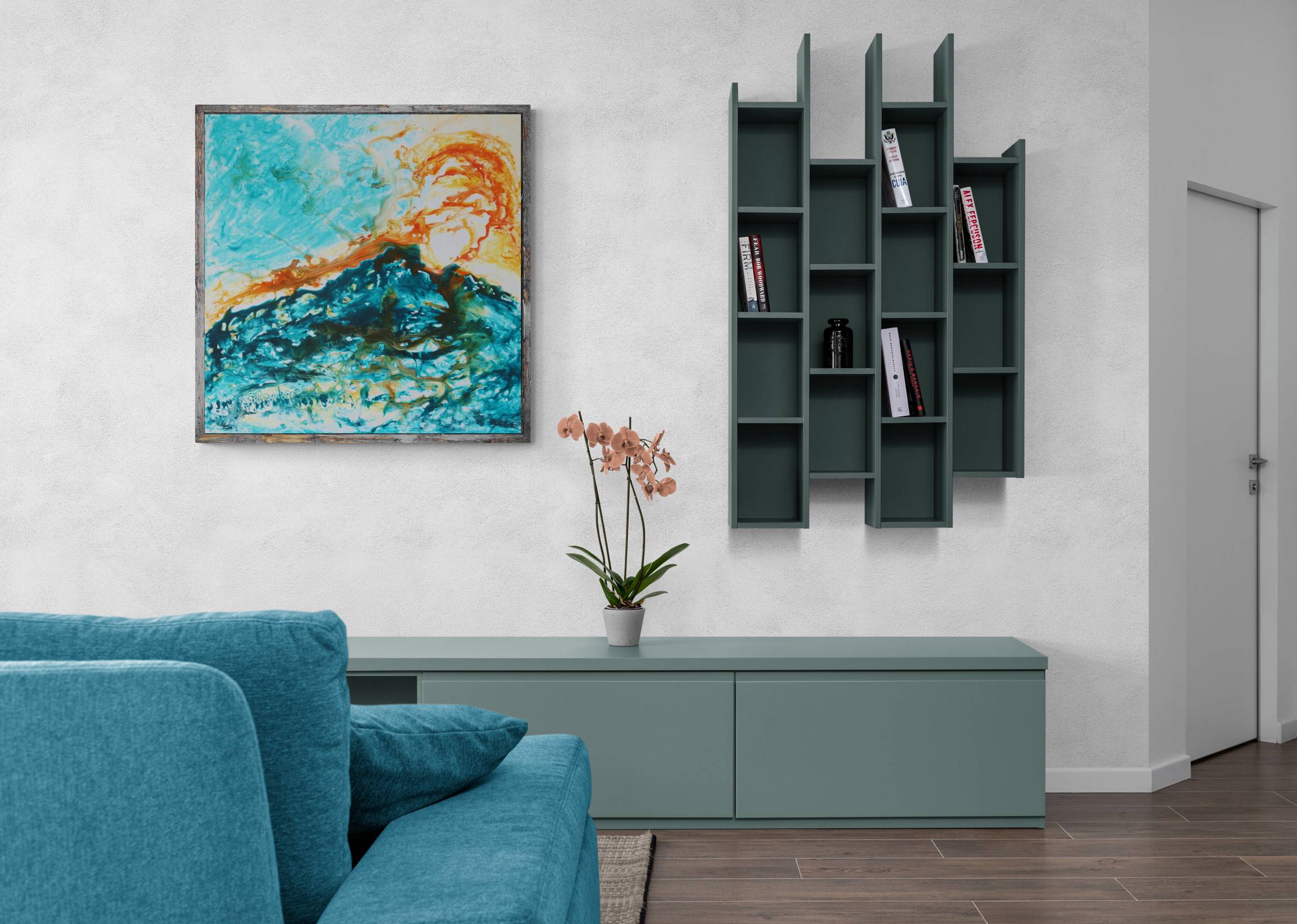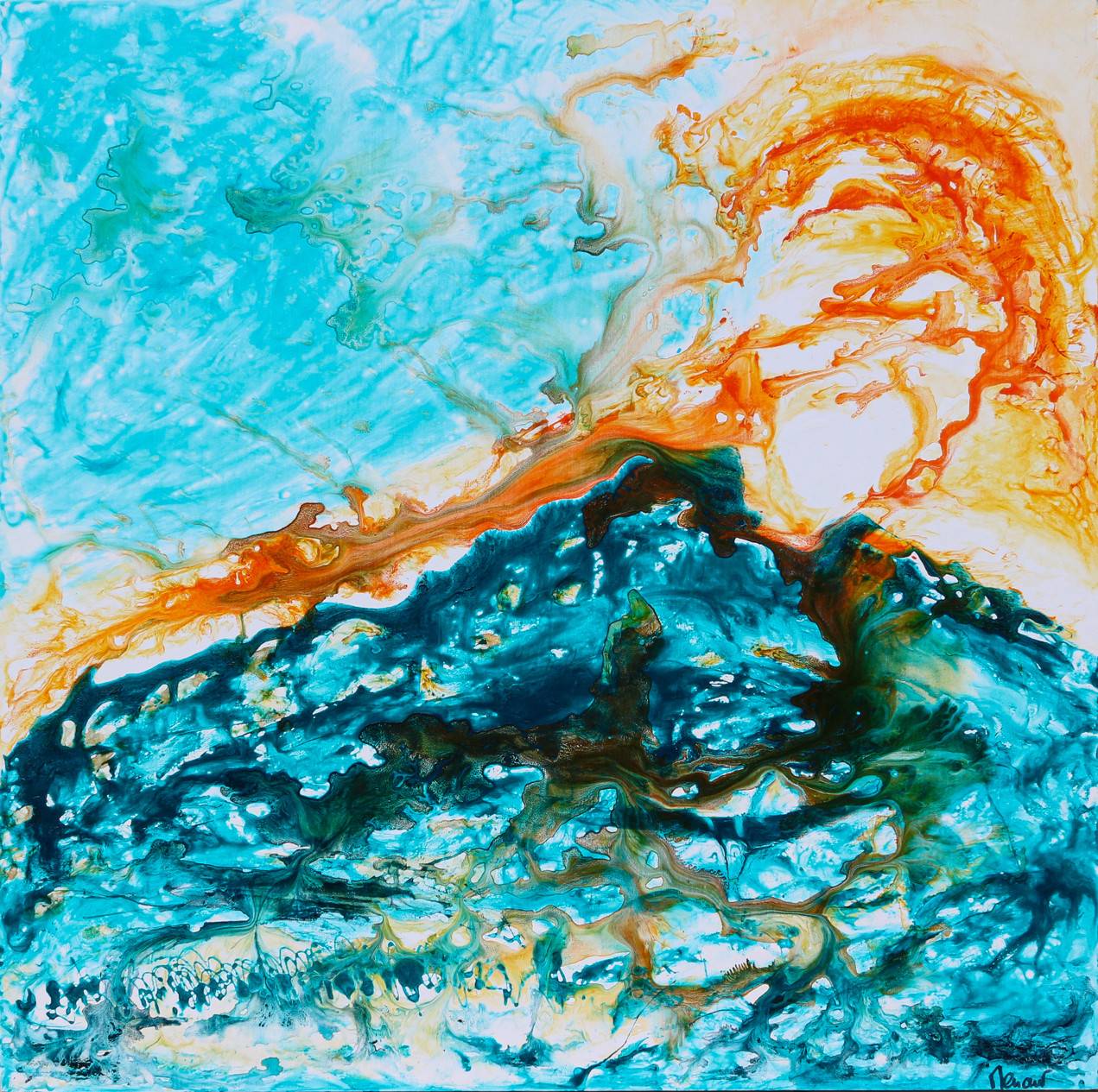 A volcanic effect, translated with light varnish, carrying the glowing lava inks in a swishing mouvement. My two favourite colours in juxtaposition make this abstract painting hot and cold, spatial.